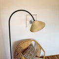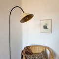 Lámpara de pie con estructura de fierro curva y pantalla de cerámica gres esmaltada en distintas tonalidades para lograr su tono ocre con detalles marrón. Su diseño simple y tono cálido la convierten en el complemento versátil para iluminar tu living, sala de estar o habitaciones.