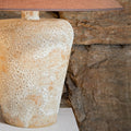 Lámpara de mesa inspirada en la costa chilena, modelada a mano en cerámica gres con porosidad visible, su base combina tonos blancos y tierra que reflejan una estética natural. La pantalla de lino camel complementa con calidez y textura.